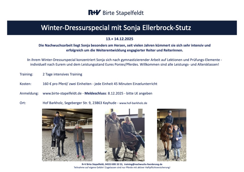 13. + 14.12.2025 | Dressur-Lehrgang mit Sonja Ellerbrock-Stutz - Warteliste | |